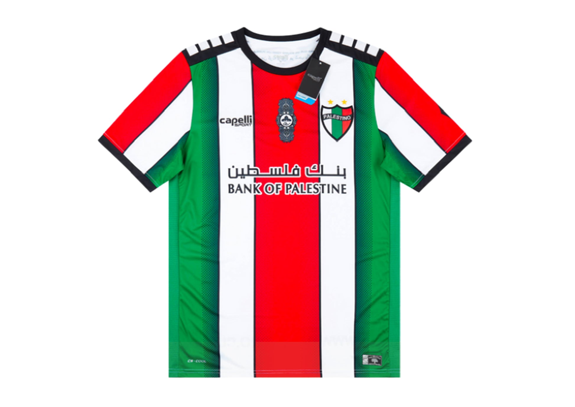 This edition features the colors of the Palestinian flag in vertical stripes, with official sponsor logos and crest. Made from breathable, high-performance fabric for comfort on and off the pitch.