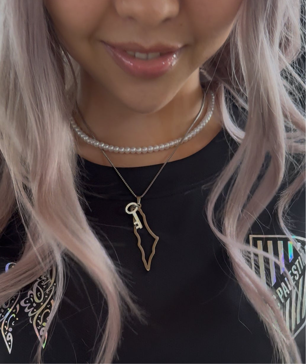 Minimalist silver stainless steel necklace featuring the map of Palestine and the key of return.